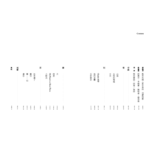 推薦序 風來花開, 更年春回 ◎廖炳惠 推薦語 邱貴芬、李桐豪、陳栢青、盛浩偉 自序 寫在書前:回春/春回 序曲 愛 山海 永恆的場域 丈夫 別 Charlie查理 他的身體 五彩雲衣 離 犬 時差 My Heart is a Ghost Town 小鮮肉 苦 你來遲了 藥引 藥——引 遺忘 尾聲 後記