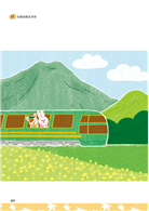 這次旅行遇見的第一次觀光列車,是從博多到由布院的「由布院之森」。綠色的車身,搭配黃色線條,還真的有一股森林的氣息傳來。進入全部都是原木打造的車廂,讓我有種想要深吸一口氣的衝動,感覺上會有一陣木頭香氣傳來呀!先把行李放到自己的位置上,再到跟一般列車不同的兩節車廂去參觀一下。餐車裡提供付費的餐點和啤酒,看起來還蠻精緻可口的,不過兔子阿姨肚子還不餓,就只是看看而已。這裡還有販售一些小紀念品,兔子阿姨拿的是一張美麗的紀念乘車證,上面有綠色的由布院之森穿過粉紅色花朵的圖案,還可以用旁邊的紀念章,蓋上當天的日期喔。才想付錢,穿著制服面帶親切笑容的小姐搖搖手,表示乘車證是免費的。高高興興的道謝後,我們再到隔壁的景觀車廂,坐在原木椅上,趴在原木長桌上,透過窗玻璃,看著外面的景物。終於知道,列車為什麼叫做由布院之森了。休耕的稻田被綠草覆蓋,白牆灰黑屋瓦的農舍,站在遠處的森林當中,更後面遙遠的高山上,還有一些些積雪。火車向前奔馳,感覺就是要前往一處美麗的森林啊。就在我們翻閱桌上的旅遊資訊,和有趣的旅客留言簿時,服務人員拿著制服帽子和一塊寫著日期的板子來了,有興趣的人都可以穿上制服,帶好帽子,拿著板子一起拍照留念喔。回到自己位置的車廂,坐在特別加高的座位上,看著窗外的景物,繼續奔向森林之旅囉!