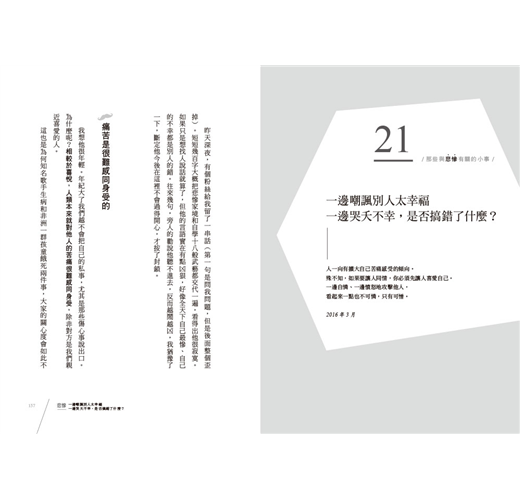 但是,從頭到尾讀過一遍後,我反而放心了,因為不管怎樣,我身上有一些部分未曾改變。在文風、想法變化的過程裡找出這點恆定特質,不失為一種有意思的觀察——這本書對我而言,是值得紀念的回顧,也因為由一堆「不是為了出書寫的文章」組成,粗糙卻實在,記錄著最接近真實的我。