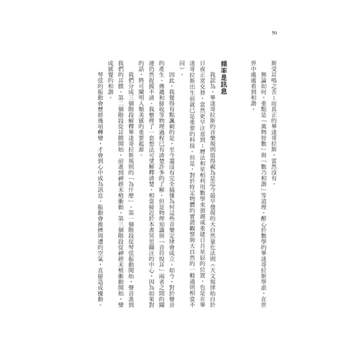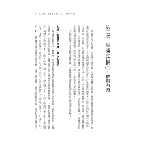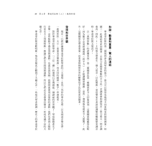 為什麼對大多數人深奧難解的當代物理理論會體現出美呢?關鍵在於本書的核心主旨:萬物皆數。更精確地說,是使用簡潔、對稱的數學方程式來表達的自然定律,千錘百煉地通過無數實驗的考驗,精確地吻合了無數經驗,使得我們不得不接受它們再現了真實(萬物背後的理),在追求這樣再現真實的過程中,物理學家感受到「減一分則太少、增一分則太多」的美。可是,要談「萬物皆數」這樣的觀念,不能不溯源至希臘哲學家畢達哥拉斯。