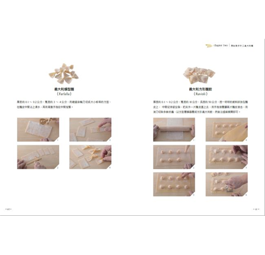 為了吃的安心以及品嘗道地的義大利麵,本書要教讀者以優良中筋麵粉製作,不添加任何防腐劑及人工色素,學著和麵>揉麵>擀壓>裁切>晾乾,學會義大利鄉村媽媽為家人手工製作的14種可愛形狀的手工麵和餃子,諸如:管麵、碟形麵、紐繩麵、貓耳朵麵、寬扁麵、方形麵餃、千層麵....等等。