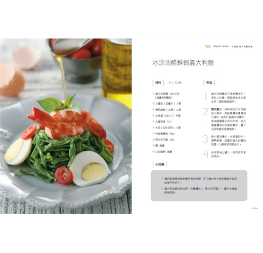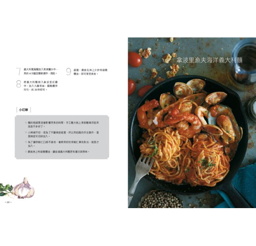 本書裡的食譜還包含少見的品項,如義大利麵做成的沙拉、餃子和甜品,搭配各種特調的醬汁和配料,烹煮出滿足感爆炸的50種家常口味義大利麵。