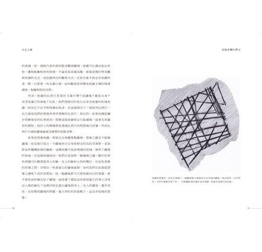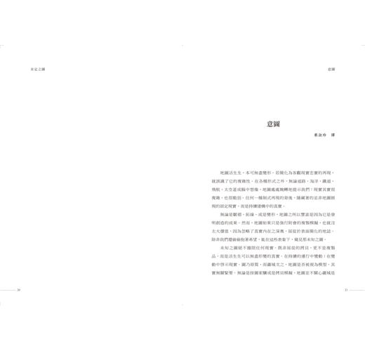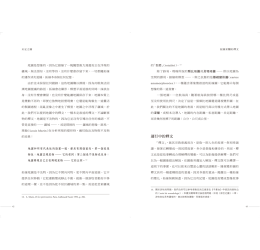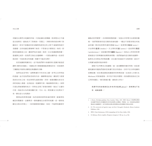 本書所關注的地圖,正是那些極力抵抗類比原則、好使我們陷入未知路徑的瘋狂深處。這些不具記憶的地圖製造痕跡,而且拒絕遵循任何軌跡,帶領我們朝向前所未見且未知的領土。
