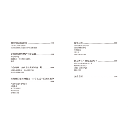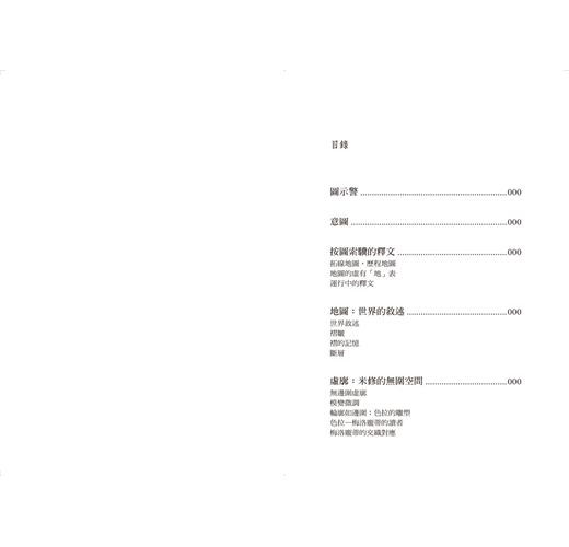 世上存在著各種地圖╱圖誌,每一種的功能角色不盡相同。有些僅是複製現實,有些則創造現實。地理學家、探想家繪製的外在圖誌之外,也有畫家、作家創制的內在地圖,它們實際上是夢想的拓線,如哲學家米修所言,「我希望所有的拓線是生命的基調。」