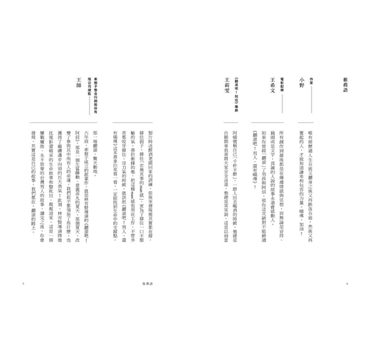 正如喵導的為人,其文字也充滿畫面感,以及簡單真摯的魅力,帶領讀者回顧這精采的奮鬥旅程。然而旅程還只來到中點,我們期待導演下一個十五年、三十年更好的作品出現!Fighting!