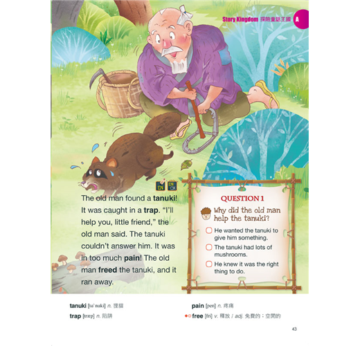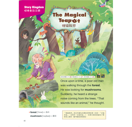 -收錄世界經典文學,以淺顯的文字及生動的彩繪插圖呈現故事內容,讓小朋友瞭解到文化典故或風俗傳說,透過童話故事培養英語閱讀興趣!本期介紹日本廣為流傳的民間故事「狸貓報恩」。在「英語維他命」單元針對故事中重要的句型以圖像解說用法並搭配練習,不僅增進閱讀能力,也加強語法能力。