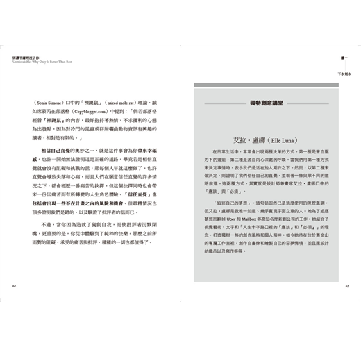 他在自己的播客節目中,親身採訪了世上多位創意先驅者:賽斯・高汀、艾拉・盧娜(Elle Luna)、提摩西・費里斯、賽門・西奈克、丹妮爾・萊波特(Danielle LaPorte)……這些全球知名人士如何開闢自身專屬的道路,並且學會抵制來自社會、組織、文化當中墨守成規的壓力。
