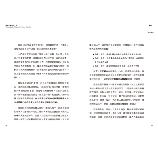 當我們不快樂到超級絕望的時候,很諷刺的是,這一刻卻也把我們放置在巨大力量之處。因為當我們感到沒有什麼可以失去的時候,這個瞬間能形成一股強烈的行動力,讓我們開始走在通往實現獨創自我的路上。