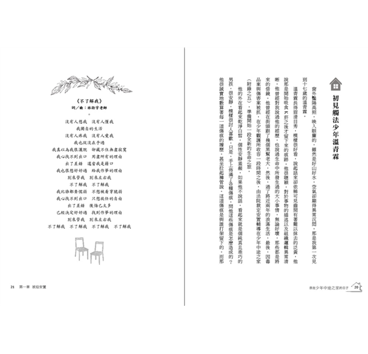 溫青霖長得眉清目秀,模樣很好看,說起話來卻依稀可見齒間有著難以抹去的泛黃,他說那是開始吸食K菸之後才留下來的痕跡。他很聰穎,對於事物的描述以及組織邏輯異常清晰。他曾經對我說過他的經歷,也說過生命中所發生過的大小事情,無論好壞,那些都是將來的借鏡。他曾經在街頭跟了幾個黑幫老大,然後,過了將近兩年的浪蕩生活,最後,因毒品案與傷害案被抓,在少年觀護所收容一段時間之後,由法院裁定安置輔導在少年中途之家(附錄之五),準備開始一段全新的生命之旅。