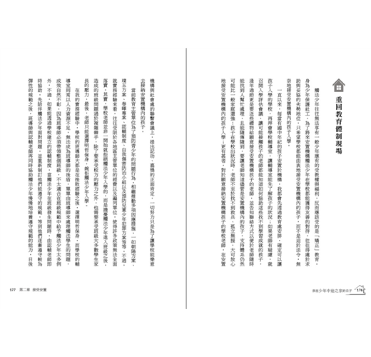 挑戰之一,是個案中心(人本)與全控機構的拉扯。我們如果花力氣讓孩子不用進監所,又何必將機構,管理成監所呢。所以,作者提出來的理想,其實應該是機構的本質才是。但這挑戰之所以仍是個挑...