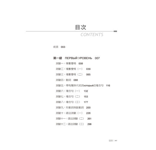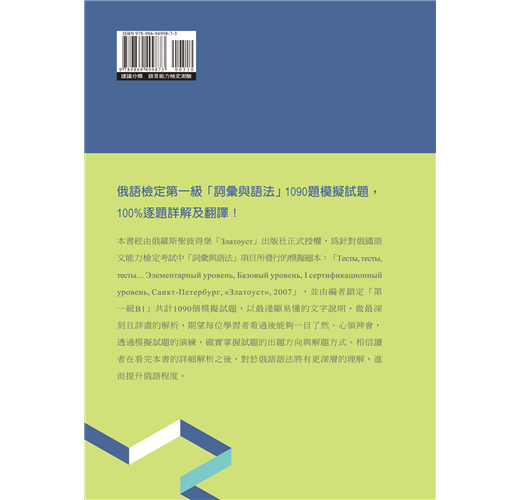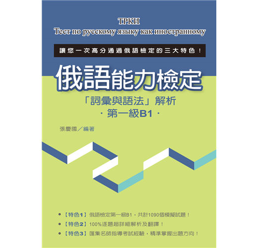 俄國語文能力測驗的各級考試皆為5項測驗項目,分別是「詞彙與語法」、「閱讀」、「聽力」、「寫作」及「口說」。本書參考由俄羅斯聖彼得堡「Златоуст」出版社針對「初級A1」、「基礎級A2」與「第一級B1」的「詞彙與語法」測驗所發行的模擬題本:「Тесты, тесты, тесты... Элементарный уровень, Базовый уровень, I сертификационный уровень, Санкт-Петербург, «Златоуст», 2007」,經該出版社授權,針對「第一級B1」共計1090個模擬試題,用最淺顯易懂的文字說明,做最深刻且詳盡的解析。同時透過模擬試題的演練,將能確實掌握試題的出題方向與解題技巧。就算暫時還不想報考檢定考試,相信讀者看過本書詳細的語法規則說明之後,將大大地提昇俄語語法的理解能力及俄語程度。