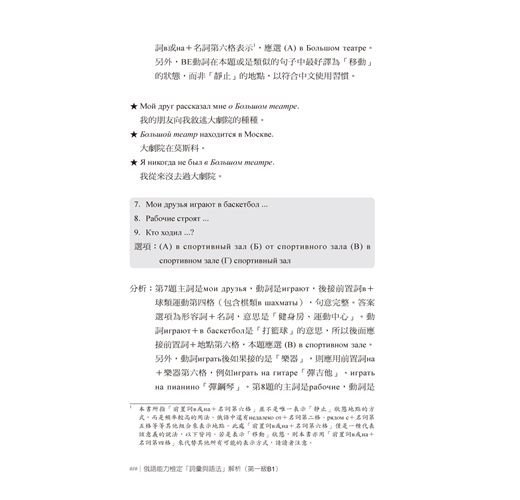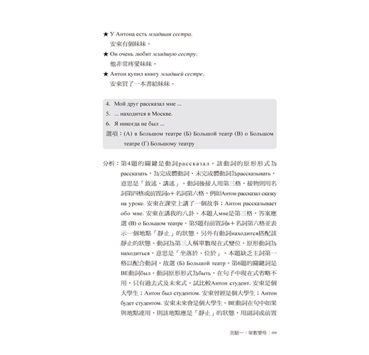 分析: 第4題的關鍵是動詞рассказал。該動詞的原形形式為рассказать,為完成體動詞,未完成體動詞為рассказывать,意思是「敘述、講述」。動詞後接人用第三格,接物則用名詞第四格或前置詞о+名詞第六格,例如Антон рассказал сказку на уроке. 安東在課堂上講了一個故事;Антон рассказывает обо мне. 安東在講我的八卦。本題人мне是第三格,答案應選 (В) о Большом театре。第5題有前置詞в+名詞第六格並表示一個地點「靜止」的狀態,另外有動詞находится搭配該靜止的狀態。動詞為第三人稱單數現在式變位,原形動詞為находиться,意思是「坐落於、位於」。本題缺乏主詞第一格以配合動詞,故選 (Б) Большой театр。第6題的關鍵詞是BE動詞был。動詞原形形式為быть,在句子中現在式省略不用,只有過去式及未來式,試比較Антон студент. 安東是個大學生;Антон был студентом. 安東曾經是個大學生;Антон будет студентом. 安東未來會是個大學生。BE動詞在句中如果與地點連用,則該地點應是「靜止」的狀態,用副詞或前置詞в或на+名詞第六格表示1,應選 (А) в Большом театре。另外,BE動詞在本題或是類似的句子中最好譯為「移動」的狀態,而非「靜止」的地點,以符合中文使用習慣。
