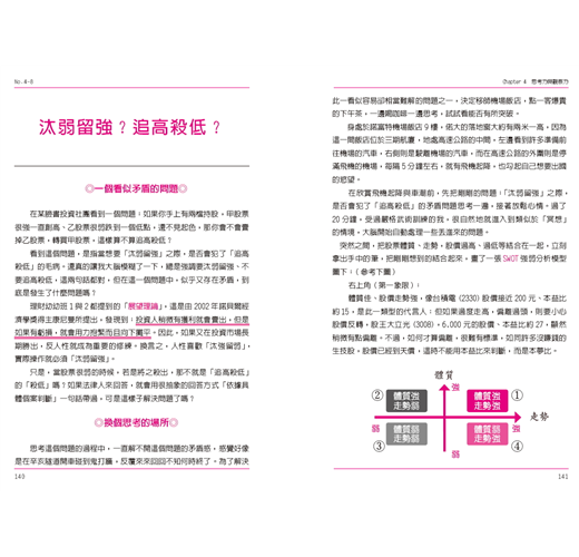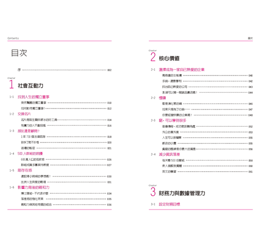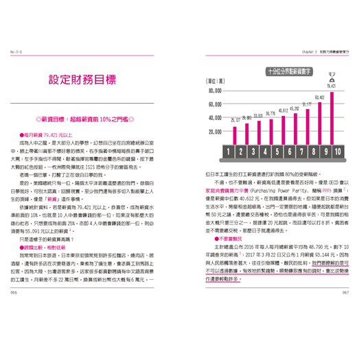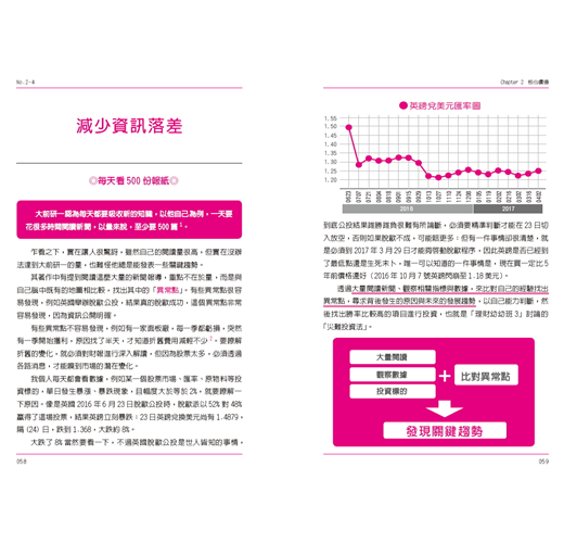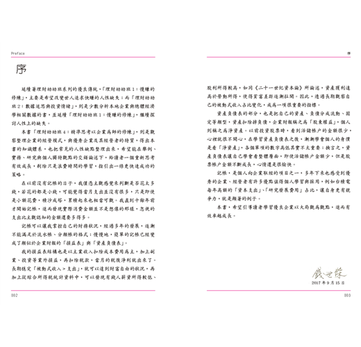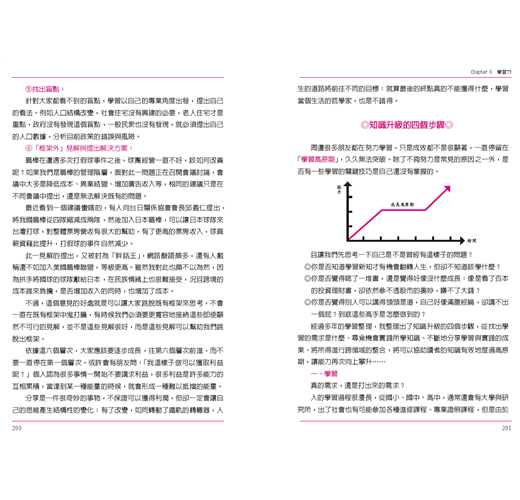 接下來幾章就是具體說明要如何提升自己的能力,如第三章的財務力與數據管理,教讀者該怎麼設定財務目標,從現金流量表檢視自己的財務狀況,並且學習風險控管。而作者更秉持著「授人以魚,不如授人以漁」,期望讀者能培養獨立分析數據的能力,才能避免被帳面上漂亮的數字欺騙,進而培養出卓越的投資眼光。