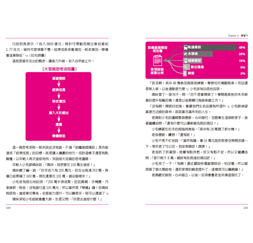 而《圖解理財幼幼班2:數據迷思與投資情緒》,則從總體經濟學的角度出發,探討在少子化、高齡化等因素的影響下,全球經濟的發展趨勢。作者特別整理台灣的相關資料,就是希望讀者除了能夠掌握國際的經濟局勢外,更能瞭解台灣本國的經濟概況,培養精準的投資眼光。而談完大環境的發展動向後,便是協助讀者訓練自己的投資判斷力,從行為經濟學挖掘出旁人未曾注意到小細節,並避免不理性的投資行為。這就像自我訓練之後,總是要實際打怪,才能知道自己是否熟練、學以致用,並增加實戰經驗值。
