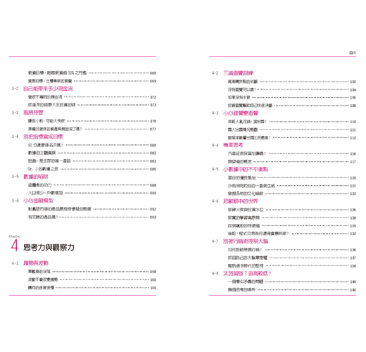 本書舉出許多國內外實際案例,一步一步帶領讀者學習如何分析,並內化培養慧眼。這如同累積個人能力和學習理論之後,透過實例來檢證自己學習的成果,更在這之中不斷修正、調整。畢竟趨勢是瞬息萬變,要保持持續更新的心態,才能因應社會。