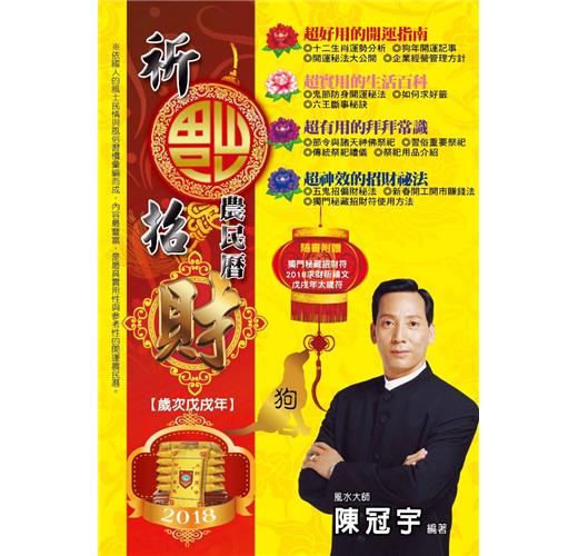 《祈福招財農民曆》是風水大師陳冠宇根據國人的風土民情、風俗習慣所彙編而成,內容豐富實用,參考價值高,完全符合國人的傳統禮俗與實際生活,是您一年三百六十五天都不可或缺的開運導師,也是您求財納福絕對不可少的最佳指南!