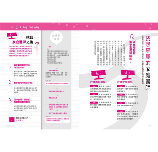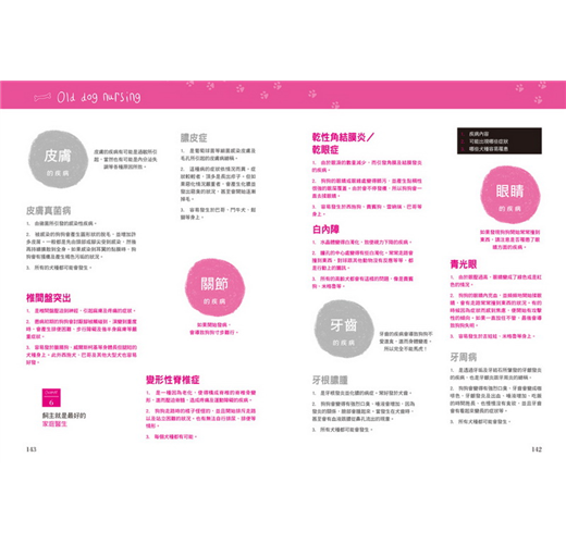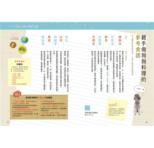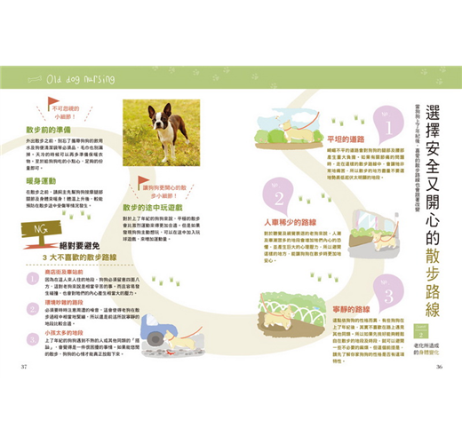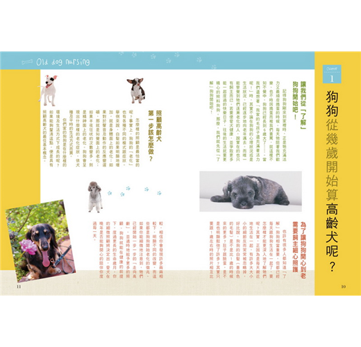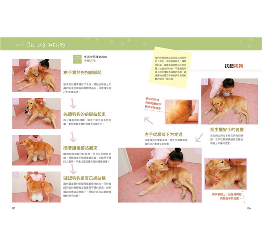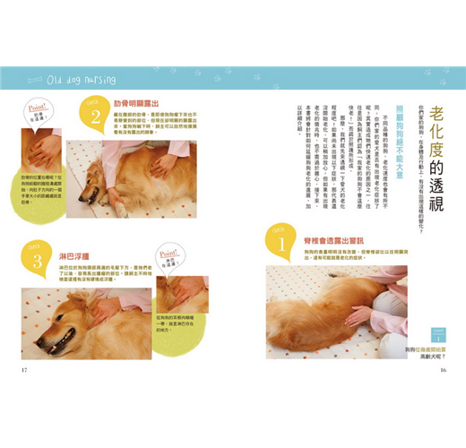 本書收錄了狗狗老化後,會遇到的各種狀況,比如,可能會無法自行排泄,這時,就必須按壓膀胱,協助牠排尿,可是膀胱在哪裡呢?別擔心,書中都會附上實際照片,教導你要如何協助狗狗;除此之外,作者還會依據每隻狗狗老化的狀況,做個別解說喔!