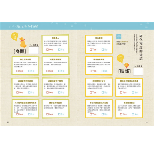 本書針對狗狗的「臉部」、「身體」、「身體狀況」及「行動」進行全方位剖析,幫助飼主了解你家的狗狗是不是已進入老化過程,並確認老化程度。