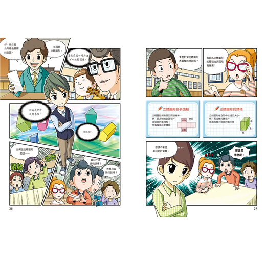 本書將國小、國中和高中的數學課本改成「知識漫畫」的形式,指的是利用趣味爆笑的故事情節和各式各樣的例子,以漫畫的方式來講述數學理論或概念的一種學習方法。數學教科書以解題或計算為主的內容,本書則轉換成了重視計算過程、創意性思考為主的內容。