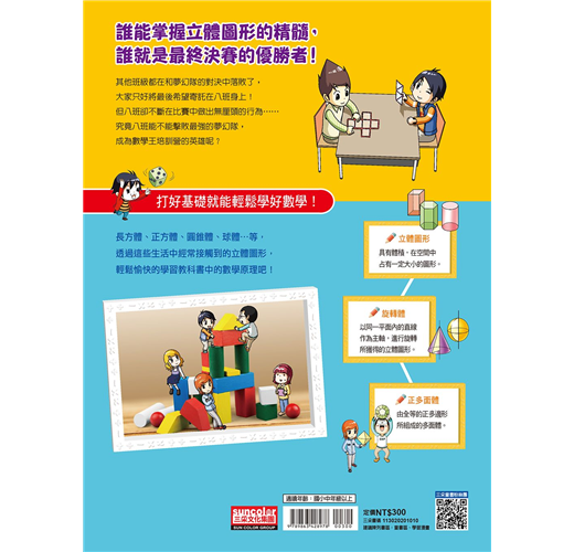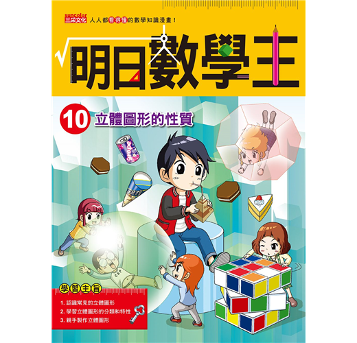 我們在日常生活中能夠輕易接觸到立體圖形,因為無論是球、積木、生活用品、以及大樓和汽車等,世界上所有一切都是由立體圖形所架構而成。常見的立體圖形包含正方體、圓柱、角柱、角錐和正球體等。透過這些立體圖形,可以讓我們熟悉圖形的基本性質,並培養空間概念。在第十集中,我們將介紹立體圖形的種類、展開圖、透視圖和相關的幾何知識。希望各位透過本書,可以認識生活中常見的立體圖形,以及隱藏在立體圖形中的有趣原理。