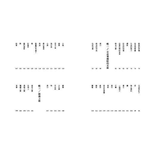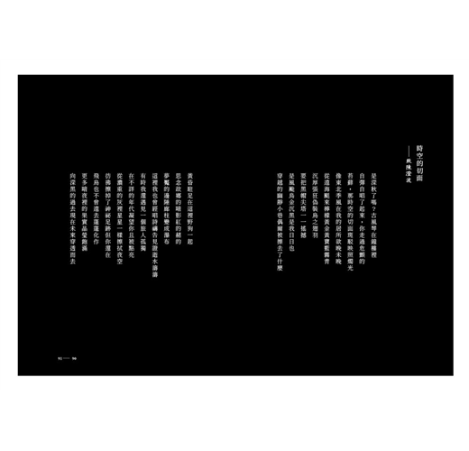 這本詩集,是五年來複雜心境的總結。(當然,還有一些更早的,例如〈黑暗之歌〉、〈星窗〉、〈巴爾蒂斯〉、〈妄念西雅圖〉、〈一張照片〉、〈繭〉。)在編排上,我特意將沉鬱近黑的放在前面,而逐漸趨向輕盈趨近白,無疑也是對自己的期待:我不希望在黑暗中停留太久。