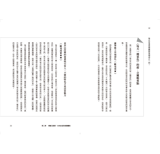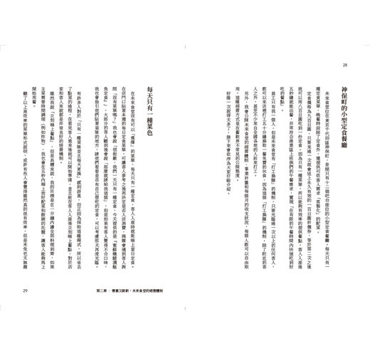 前言 第一章‧未來食堂是間什麼樣的店家? 神保町的小型定食餐廳/每天只有一種菜色 〈每天一種菜色〉的超.合邏輯重點 由客人決定下周菜色/一個人也能有效率應付工作的店內規畫/ 在網站上公開每個月的收支和創業計畫書/提供餐飲業「Open Source」(開放原始碼) 〈公開化〉的超.合邏輯重點 第二章‧懷舊又創新,未來食堂的經營體制 1‧打工換膳:工作五十分鐘可以獲得免費的一餐 ◎用漫畫看懂「打工換膳」 從某天的「打工換膳」體驗開始/「打工換膳」不划算嗎?/「三百日圓」變成「九百日圓」的價值/不是客人也不是員工的「第三種角色」/新的工作方式──餐飲業的「Cloud Resource」/比判斷「是否為可用人才」還重要的事情/如果真的來了「幫不上忙的人」怎麼辦?/沒有工作手冊時的「屬人性」較低/參加打工換伙膳的人們──除了沒有餐飲經驗的人之外也有中學生/嚴格執行「不能觸碰食品」,不過只要通過衛生檢查就OK/來自國內外想開餐廳的人/以自已的創意菜色挑戰兩百人的份量/為了將來,先在未來食堂經歷失敗/目前為開便當店的打工換膳者/利用打工換膳者的智慧讓餐廳更進步/不慰留打工換膳者的理由/其實我並不知道「來的會是什麼樣子的人?」/不想切斷與客人的緣分/即使被嘲笑還是認為「想變成一間讓沒有錢的人也能進來吃飯的餐廳」/傳承給打工換膳者的DNA──不是連鎖餐廳的模式,未來食堂的進化型式 〈打工換膳〉的超.合邏輯重點 2‧免費餐:撕下一張貼在牆上的餐券就能獲得免費一餐 ◎用漫畫看懂「免費餐」 「免費餐」的起源/誰貼上去? 誰撕下來?/助人的困難,如果每天都有人使用怎麼辦?/「讓我得到幫助了」就算是謊言也好/如果是「看起來很可憐的人」就可以使用嗎?/「禁止將免費餐券帶走」──從錯誤經驗中所衍生出來的規則/不知道什麼才是正確的/無記名,只寫上日期的「免費餐券」──螺旋狀的溝通方式/稱作「免費用餐券」的理由 〈免費餐〉的超.合邏輯重點 3‧客製小菜:根據你的需求客製化配菜 ◎用漫畫看懂「客製小菜」 「客製小菜」的起源/「無菜單料理」和「客製小菜」的不同/不區分食材類別的「冰箱中的清單」/不只是被期待「完成一道菜」/聽到任何需求時不感到驚訝,用平常心接納「普通」/未來食堂是「定食餐廳」的理由/「客製小菜」能被接受嗎?開幕前的嘗試/「客製小菜」的經營優勢/午餐時段以「無法客製化」達到客製化服務/真正的目標是「不進行客製化」 〈客製小菜〉的超.合邏輯重點 4‧樂捐飲:可以攜帶飲料,但是必須留下一半送給未來食堂 ◎用漫畫看懂「樂捐飲」 「樂捐飲」的場景/「樂捐飲」的起源/「獲利」的是誰?/讓利他行為更容易發生的秘訣/從店家角度觀察到的「樂捐飲」優勢/「送給店家」和「送給其他客人」的不同/「分享」和「樂捐飲」的不同 〈樂捐飲〉的超.合邏輯重點 5‧何謂未來食堂的特色 「螺旋狀交流方式」和其理由/「一對一的交流方式」和其理由/「懷舊又創新的模式」和其理由/「當下的人性本善主義」和其理由 第三章‧創造新事物的能力 從想法變成現實的過程/利益就像客人們投下的選票,金錢並不是壞事/把原來覺得我愚蠢的人一起變成傻子 第四章‧關於未來食堂的兩三事 何謂「十八禁招待所」/未來食堂「不理人」的接客型態/以一九六○年代時的未來所構想的店內裝潢/使用名家製作的小盤子和特別向專業職人訂製的木桶/對於食材的堅持不公開/和媒體及網路社群的相處方式/辭去上班族的工作前 後記