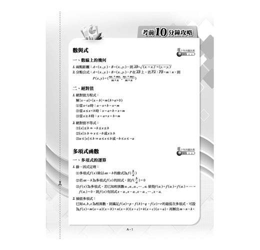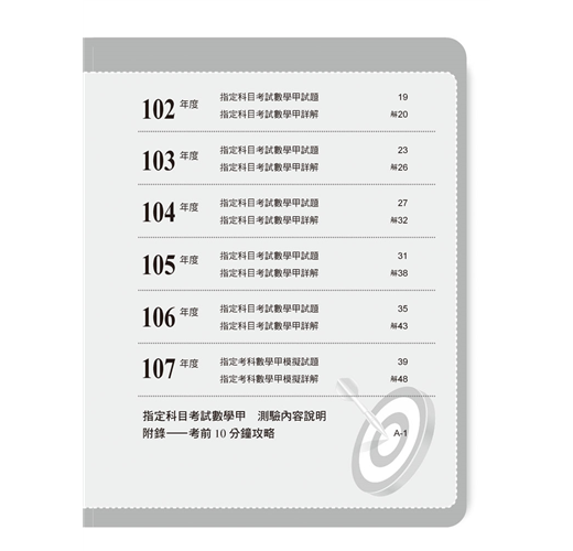 書末附上考前10分鐘攻略,依據近十年出題率及最新課綱強弱化程度,將指考測驗範圍內的各主題擇其重點精要編入,以期學子在最短時間內能掌握重要基礎概念及定理。