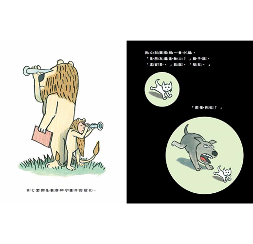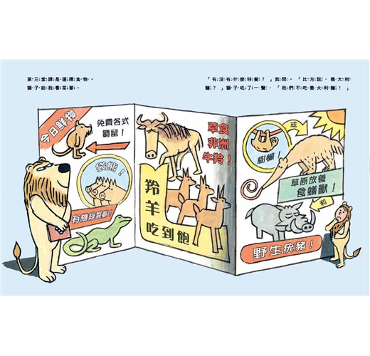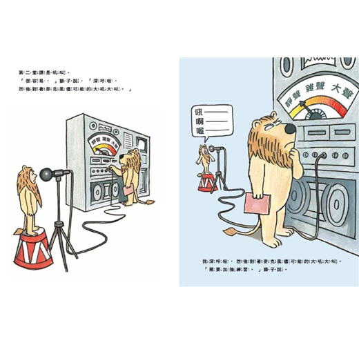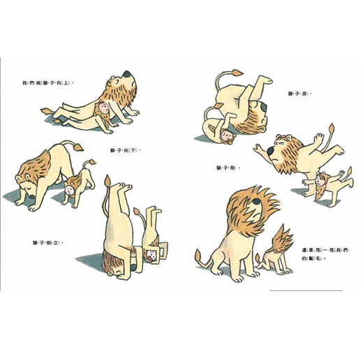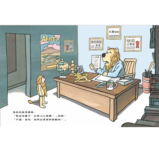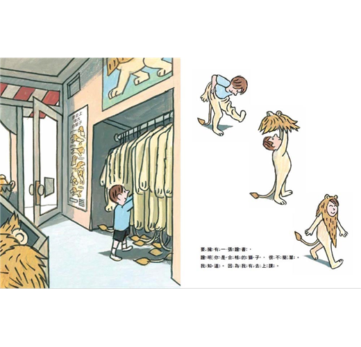 ◎小男孩來補習街上課,渴望成為一隻「被認證」的獅子,對獅子教練來說,這是一門生意,而他貢獻的就是他與生俱來的獅子本領。獅子教練的表情既認真又搞笑,小男孩的裝扮讓人想起《野獸國》裡穿著野狼服裝的馬克斯,只是這回小男孩變裝是為了讓自己變強。──艾胥黎