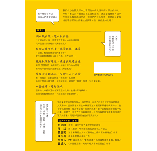 這群文壇宗師們有的惱人、有的憨直,但他們在個人成就和情感需求,其實和今人並無兩樣。對生命熱情不減,困厄和不遇時偶爾碎念;對社會滿懷理想,貶斥世俗也不忘抵抗現實。書中以輕鬆活潑的文字和敘事,揭開了一張張古人的真實面貌。他們不再是國文課中那樣遙不可及的形象,而更像是我們身旁的可愛朋友。