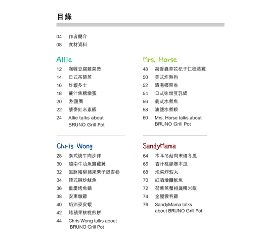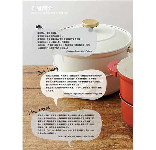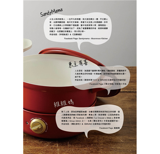 6 位主廚各擅勝場,使用相同的煮食神器,卻變化出 6 種意想不到的新煮意!主廚們 Allie、Mrs. Horse、Chris Wong(我的C家廚房)、東主有喜、SandyMama及維維媽,聯手合作給你耳目一新的食譜體驗。