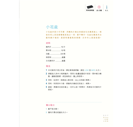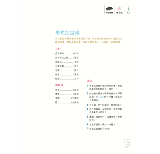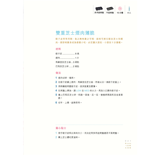 主食化成一口小吃,方便美味又飽肚。除了中西式食譜,此書還有日意泰的菜式食譜,並將複雜的煮食方式簡化,善用Bruno各款烤盤,煮出令人驚喜、並能一口吃掉的菜式。