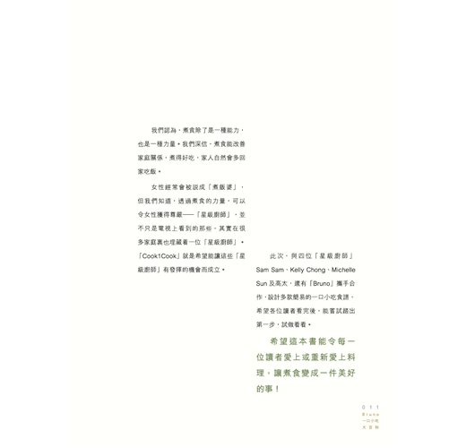 自從放下工作後,就專心去做一個家庭主婦,照顧每一位家庭成員。煮餸,已經成為我每日的重要職責。今次很榮幸能與其他三位作者合作出版食譜,這本書的菜式都是用了Bruno電熱鍋去烹煮,做法簡單,是大眾都能輕易做到的菜式。