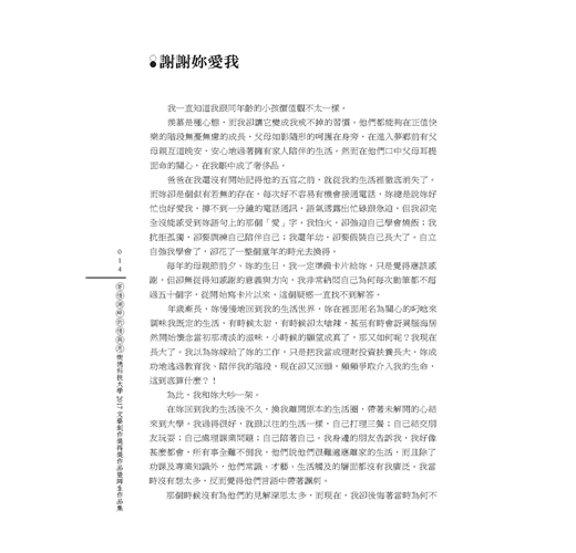 在妳回到我的生活後不久,換我離開原本的生活圈,帶著未解開的心結來到大學。我過得很好,就跟以往的生活一樣,自己打理三餐;自己結交朋友玩耍;自己處理課業問題;自己陪著自己。我身邊的朋友告訴我,我好像甚麼都會,所有事全難不倒我,他們說他們很難適應離家的生活,而且除了功課及專業知識外,他們常識、才藝、生活觸及的層面都沒有我廣泛。我當時沒有想太多,反而覺得他們言語中帶著諷刺。
