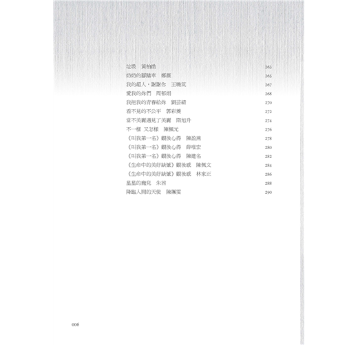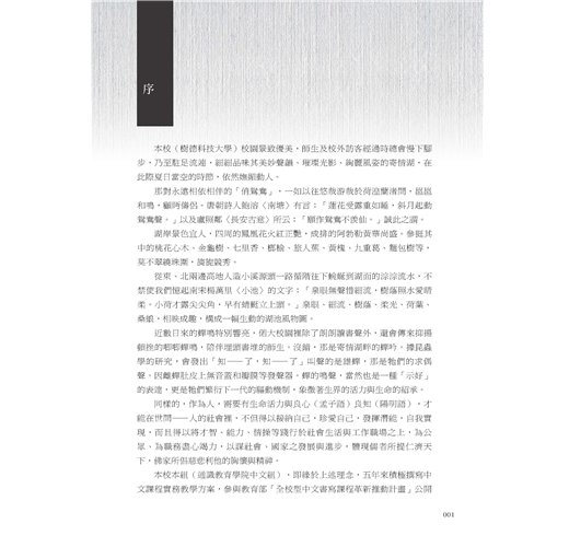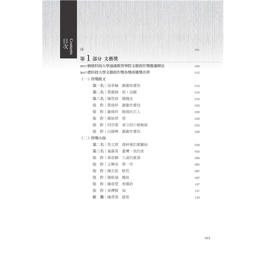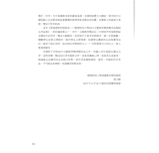 本書除了本校2017文藝創作獎得獎作品之外,尚編入同年度師生優良文作。這些佳構,概為每位作者最新力作,或是其讀書心得,或是其生活感受,無論就生活應用或生命啟示盱衡,皆有其意義與價值。當然,本書的所有作品,不可能完美無瑕,尚請讀者指教為荷。