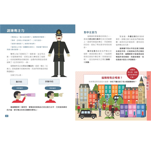 以大量有趣的圖像,簡單扼要地解釋不同的破案技能及大腦的工作,增添孩子閱讀趣味。