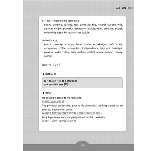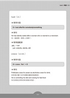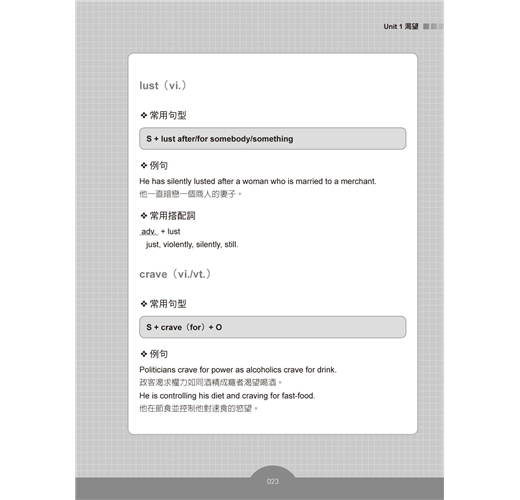 幫助讀者明白每個單字可以出現的句子結構以及例句,建立上下語文情境的概念,例如不及物動詞(vi.)後面不能出現受詞,或某些動詞常用在被動語態,例如: