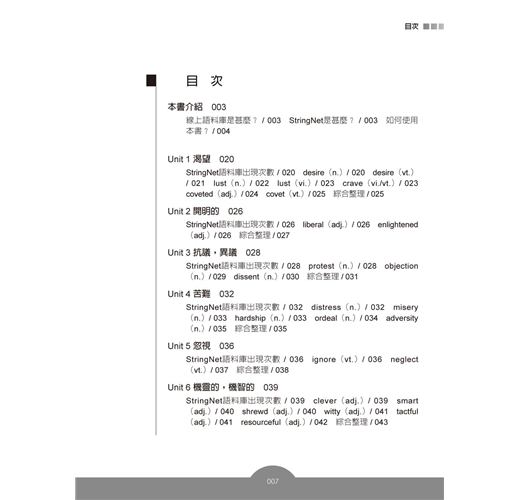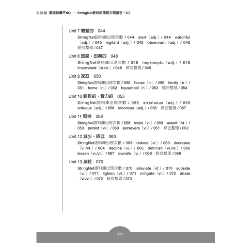 本書的目的在於釐清意義容易混淆的英文單字,編排時以中文意義為考量,而非英文單字的拼法,因此本書內容是按照中文注音符號的順序排列,已經出版第一冊包含ㄅ到ㄈ,第二冊包含ㄉ到ㄍ,本書為第三冊,也是最後一冊,包含ㄎ到ㄩ。