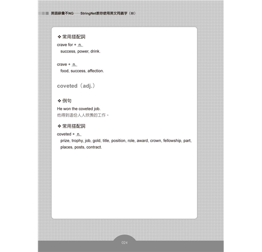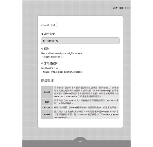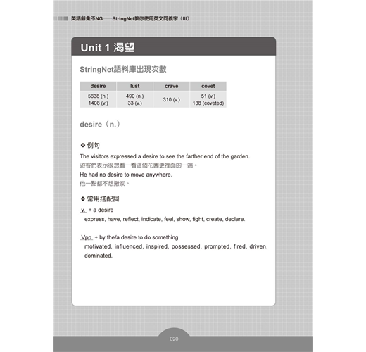 StringNet語料庫出現次數 desire(n.) desire(vt.) lust(n.) lust(vi.) crave(vi./vt.) coveted(adj.) covet(vt.) 綜合整理