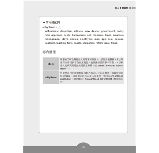 enlightened 對事情抱持明智的態度且對人則以公平仁慈對待。前面常接比較級more,後面的名詞可以是人或事物,常用在enlightened absolutism(開明專制)和enlightened self-interest(開明的自利)。