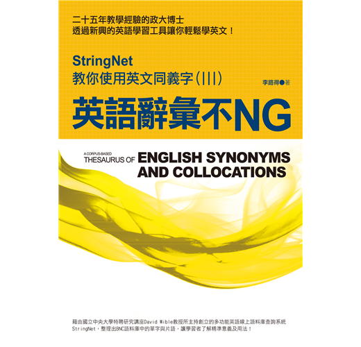 由於StringNet的功能複雜,不易學習完整檢索方法,因此本書針對單字搭配詞的部分整理彙編,以俾讀者學習某一單字常用那些搭配詞,及這些搭配詞是否有共同特點(例如前面動詞recruit後面出現的受詞都是人類),並且把一組同義字合併彙整討論,以比較同義字之間的搭配詞有否差異。