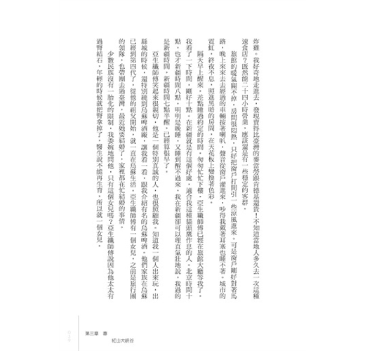 與其在霓虹燈中醉看都市的繁華,我寧願和新疆人一起搭著老舊的巴士,搖搖晃晃地開往草原,沿途看著牛羊低頭嚙咬著春天初發的嫩草;我寧願到哈薩克人的奶茶店裡,因為吃到一個一塊錢的巴爾札克而歡喜;我寧願頂著零下三十度的酷寒,去看圖瓦人怎麼燒水,在廚房裡看他們切土豆絲、做家常的菜。