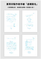 八款隨機出貨,每個簽名都像一則短篇小說!簽名靈感出自書中故事〈非真心簽書〉(請參考「內文連載」),作者創意噴發:獻給上下顛倒的台灣朋友、30世紀的作家寫給21世紀讀者、寫給來自遙遠過往的古人讀者、給來自外星球的讀者、給艾加凱磊的第一個台灣讀者、給有超能力的台灣朋友……翻開書頁絕對驚奇!