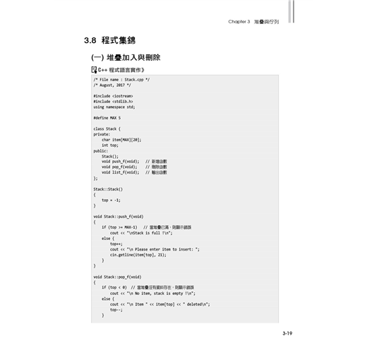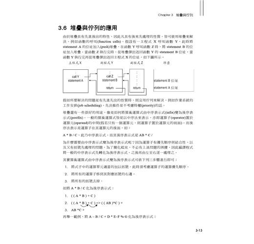 內容共分十三章,分別為第一章演算法分析、第二章陣列、第三章堆疊與佇列、第四章鏈結串列、第五章遞迴、第六章樹狀結構、第七章二元搜尋樹、第八章堆積、第九章高度平衡二元樹、第十章2-3 Tree, 2-3-4 Tree及B-Tree、第十一章圖形結構、第十二章排序,以及第十三章搜尋。