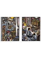 由此看來,這本書的畫面就像無字圖畫書一樣,畫家藉著圖畫串連起故事線,運用細節表達時間、情緒和情節的轉折,並且架構起場景,營造從傍晚到深夜,再到早晨的光線和氣氛,刮版畫厚重的黑色線條尤其適合刻劃光影對比,表現重量與體積。不過,當我們將圖畫配合文字一起欣賞的時候,更會發現詩裡面比較抽象的意念如何巧妙的轉化成了可以理解的圖像,讓我們更能欣賞字句當中的節奏、隱喻與美感。這樣的文圖合作實在難得!