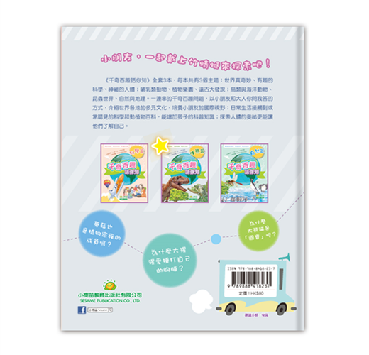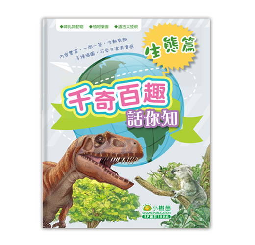 《千奇百趣話你知》全套3冊,每冊共有3個主題:科學篇——世界真奇妙、有趣的科學、神祕的人體;生態篇——哺乳類動物、植物樂園、遠古大發現;自然篇——鳥類與海洋動物、昆蟲世界、自然與地理。