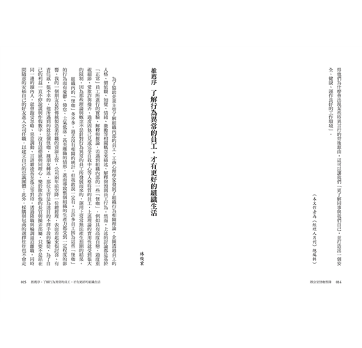 「……若工作上遇到『怪咖』,要怎麼應對呢?首先要從了解他們開始,並從不當行為中找出對應之道,本書的作者都是執業的醫師,對於這些不當行為有精闢的解釋,並提出組織人如何對應的建議。」