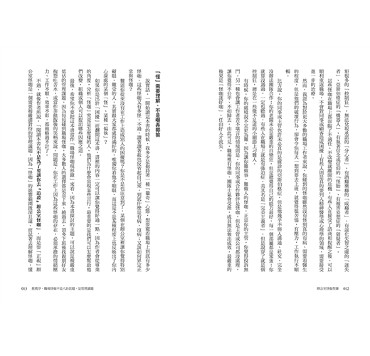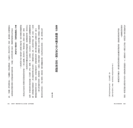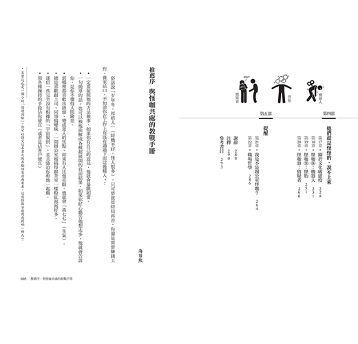 「……這本書的內容相當豐富,作者還非常貼心的在每一個章節的後面加上了『摘要』,讓它真的可以變成一本案頭書,隨時遇到怪咖的時候就可以翻開來尋找因應對策。」