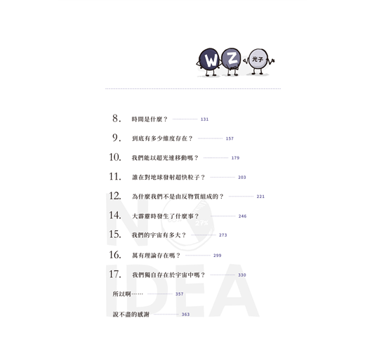 宇宙奧祕何其多,丹尼爾精心挑選的大哉問,著眼於僅僅透過觀念討論,毋需數學公式就能讓非物理專業讀者能深度理解的課題。以此原則挑選主題難免有遺珠之憾,譬如丹尼爾在第十六章〈萬有引力存在嗎?〉中只簡略提到:夸克與夸克間可以互相轉變,微中子和微中子間也可以互相轉變。還有好多現象在了解宇宙的基本運作方式上非常重要,但是要理解這些現象背後的觀念需要有很多數學知識,我期待丹尼爾與豪爾赫能發揮創意,在未來的科普書中詳加介紹 。