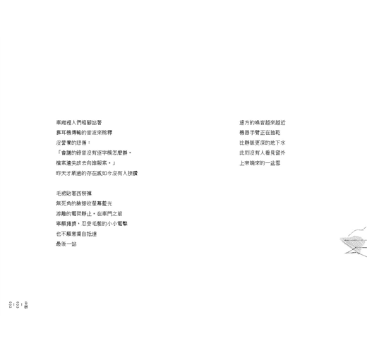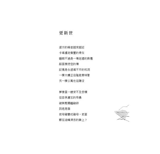 另一首直寫都更的〈更新世〉,猶如當代城市的小史詩。描述舊屋被摧毀成一塊塊「挖空的墳」,無殼鬧鐘喚醒無殼人,母雞變成變賣的雞母。人們就像緊偎在捷運裡的旅客,無可選擇地被載往預知的終站。「會議的錄音沒有逐字稿」、「檔案遺失」直指官方推動都更計畫的蠻橫粗暴,也寫下升斗小民抗爭無門的控訴。此詩的最後一段意象卓絕,可作為一首獨立的短詩:「遠方的噪音越來越近/機器手臂正在抽乾/比靜脈更深的地下水/此刻沒有人看見窗外/上帝端來的一盆雪」。城市的血液正被抽乾,而再美的自然世界,我們已無心領受。