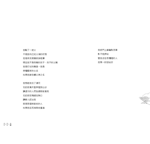 〈致敵〉應該也是任何時代反戰詩中必選的一首。這首詩是寫給敵方「替我活在恐懼裡的人」:「我想起我忘了澆花/忘記把滿天星移植到山谷/讓遠方的人們抬頭就能看見/忘記把玫瑰插在胸口/讓敵人認出我/就是那個射殺他的人」。這些意象越美麗、越令人痛楚。